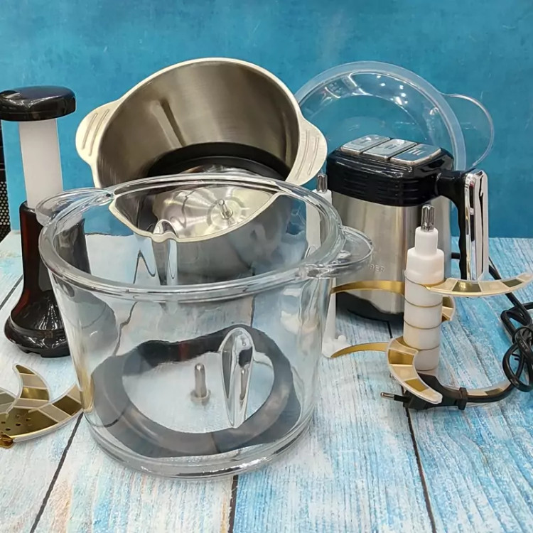 یک عدد کاسه 2 لیتری پیرکس شفاف و ضخیم یک عدد کاسه 2 لیتری استیل ضد زنگ تیغه های فولادی ضد زنگ 6 عددی و 4 عددی فناوری آلمان ولتاژ 220-240 ولت ~ 50/60 هرتز توان مصرفی 3800W موتور مسی قدرتمند 3 سرعته با قفل امنیتی حفاظت از گرمایش بیش از حد قابلیت خردکن دستی تخم مرغ زن لرزه گیر
