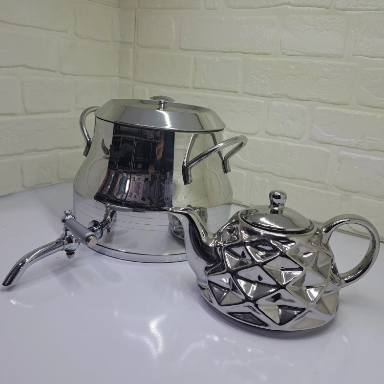 کتری قوری شیردار KINGSTON کتری استیل 18/8 ضخیم کف چدن قوری چینی